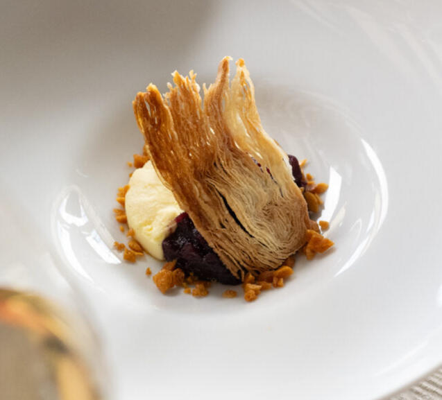 Pears, gently roasted in a fragrant bath of Jordan Cabernet and sugar, are caramel-kissed and tender. They rest on golden, flaky pâte feuilletée and are suffused with delicate vanilla notes—together an elegant balance of fruit, pastry, and understated sweetness.