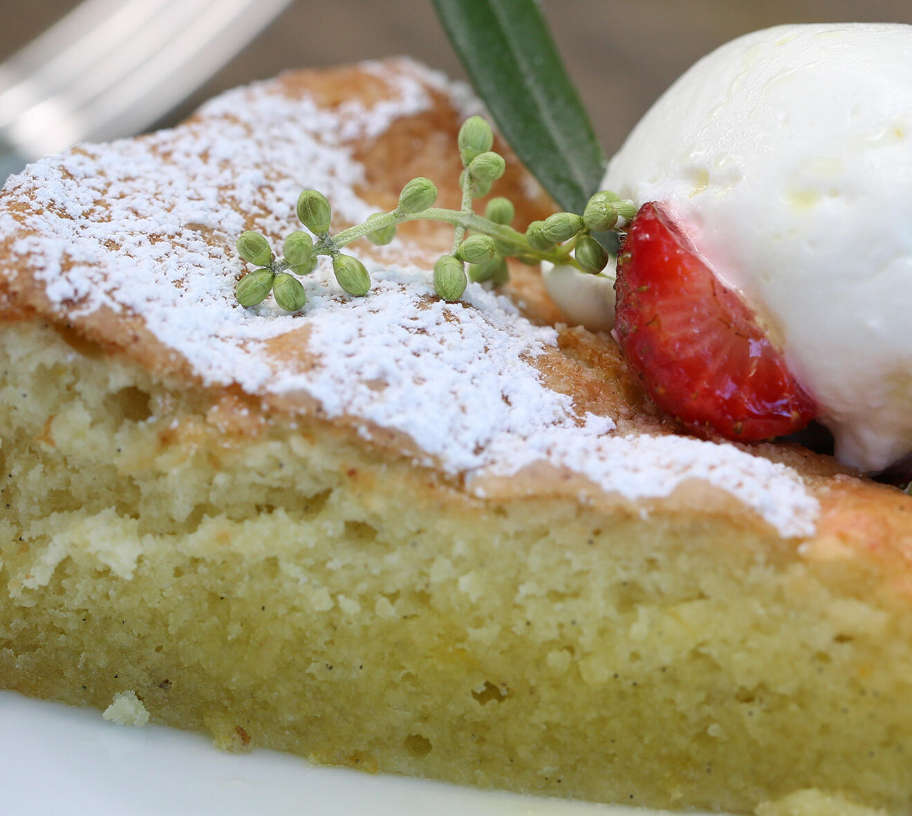 A tender, whisper-light cake laced with extra-virgin olive oil, subtle lemon, and vanilla. Its texture is moist and delicate, its flavor both mellow and nuanced. Topped with a dollop of milky cream and sliced strawberries—a graceful celebration of olive oil’s richness in dessert form.
