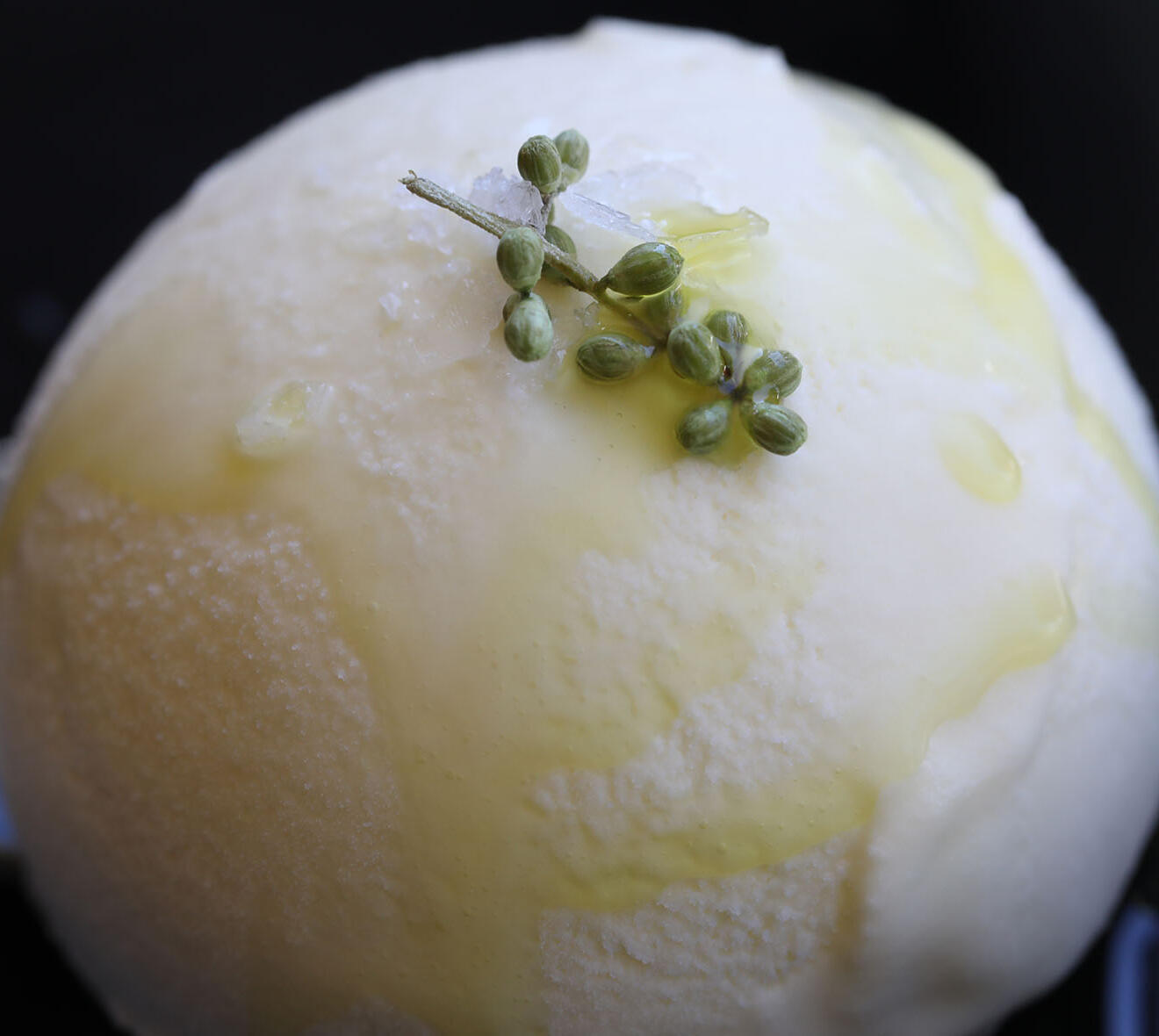 Lush and silken, this olive oil ice cream melds the gentle floral and citrus notes of Extra Virgin Olive Oil with a creamy custard base. Each spoonful is a whisper of golden richness, with a subtle hint of olive’s peppery elegance and a delicate sparkle of sea salt to elevate the sweetness.