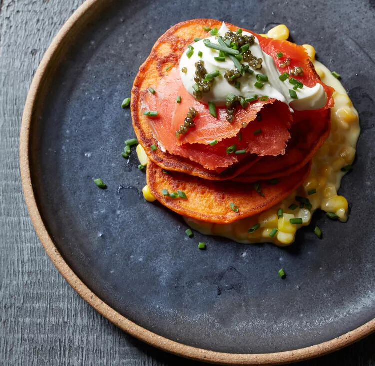 Red Pepper Blini with Creamed Corn and Smoked Salmon